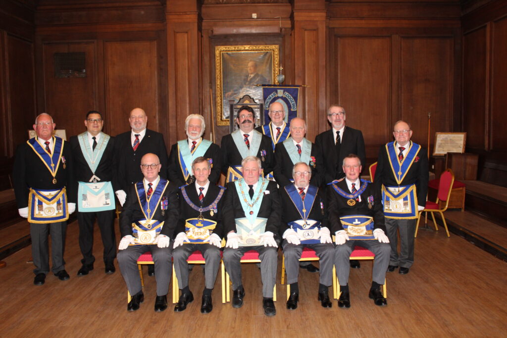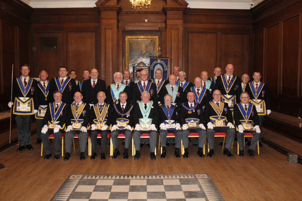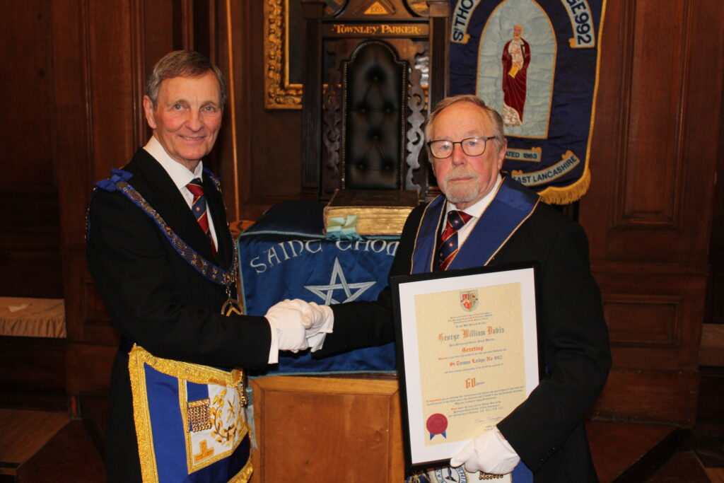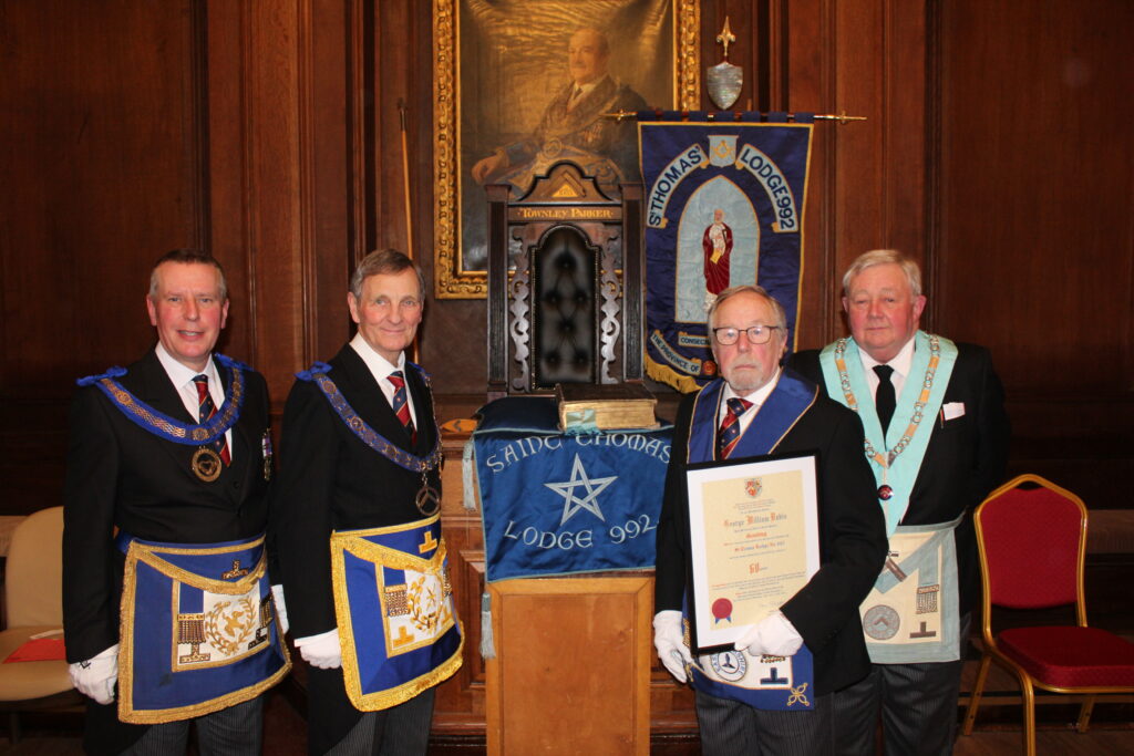 The Deputy Provincial Grand Master in charge, VWBro John Farrington, offered the Brethren an overview of George’s achievements in Freemasonry which demonstrated his outstanding commitment to the craft. He then presented George with his illuminated certificate. WBro George then received the acclaim of the Brethren, who rose together to applaud the celebrant as he was escorted around the Lodge.