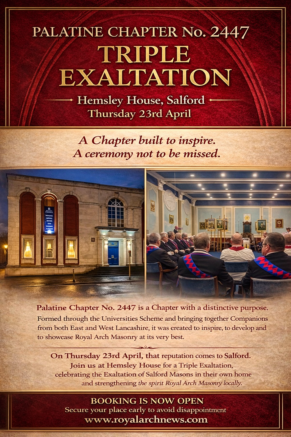 Palatine Chapter No. 2447 – Triple Exaltation at Salford Masonic Hall, Thursday 23rd April