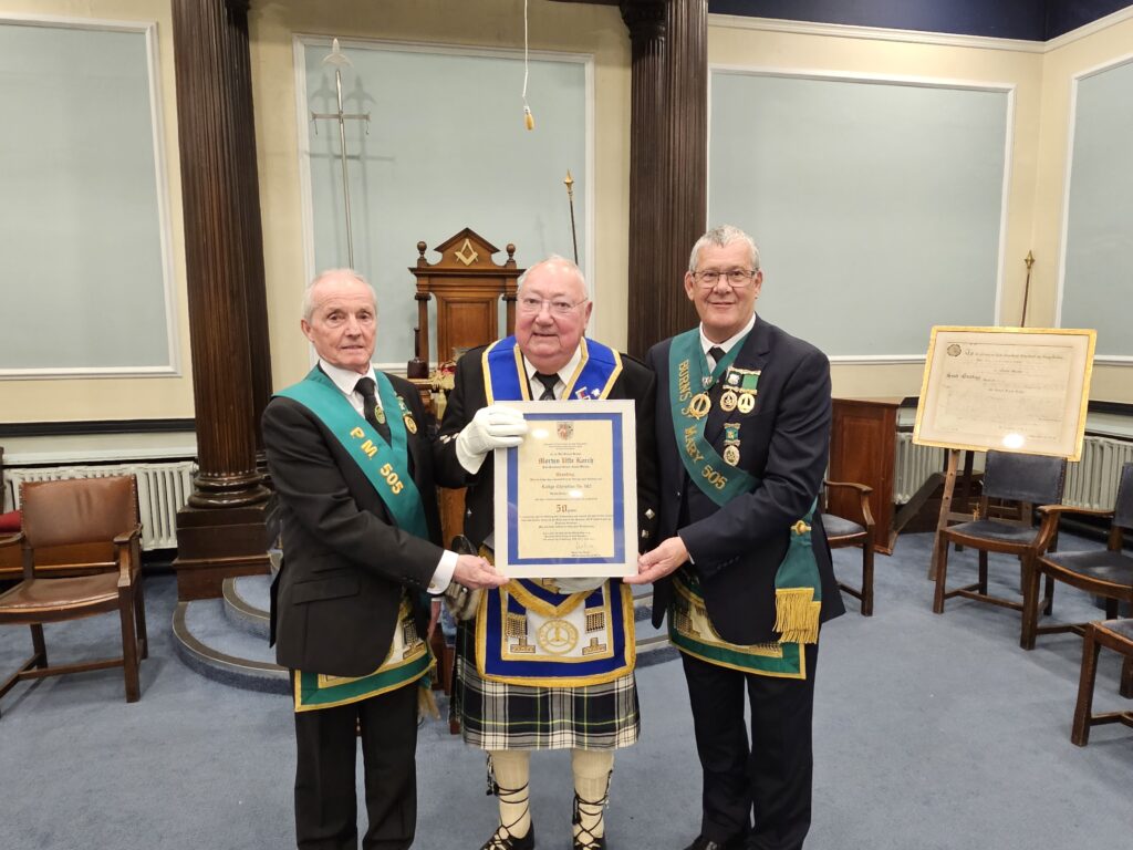 Peter Tonge then read the letter from the Provincial Grand Master before the Assistant Provincial Grand Master presented Morten with the certificate celebrating 50 years in Freemasonry.