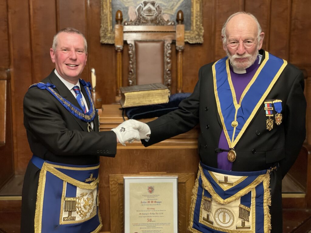 WBro Mark Davis then instructed the District Chairman, WBro Paull OCarroll, to present the coveted 50 Year lapel pin to John.