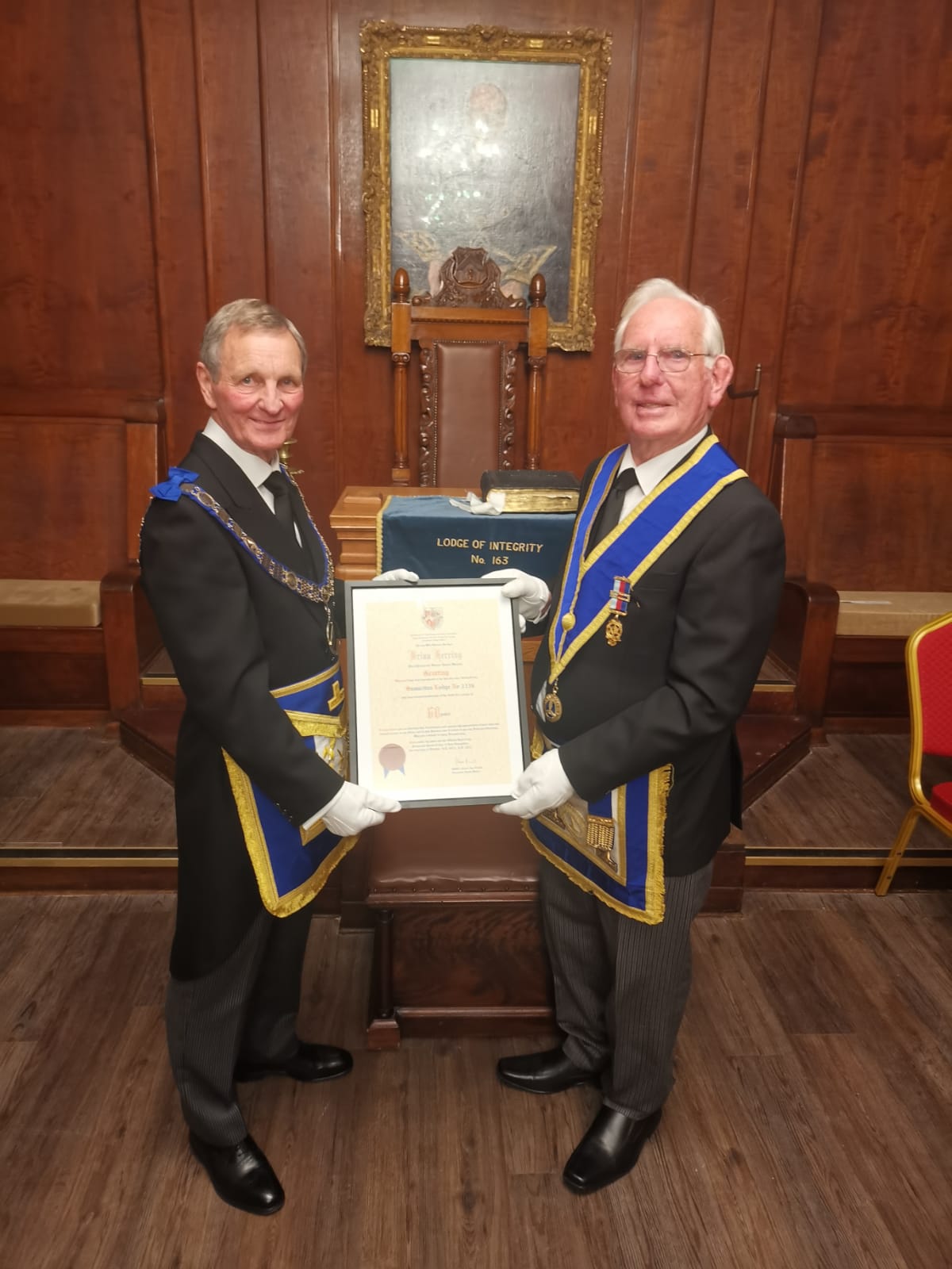 VWBro.Farrington informed the brethren that WBro Herring. had held various Offices in his Lodges and Chapters as Treasurer and Mentor. Still, his primary commitment has been as Secretary of the Lodge of Integrity no.163, an office he has held for over 20 years.