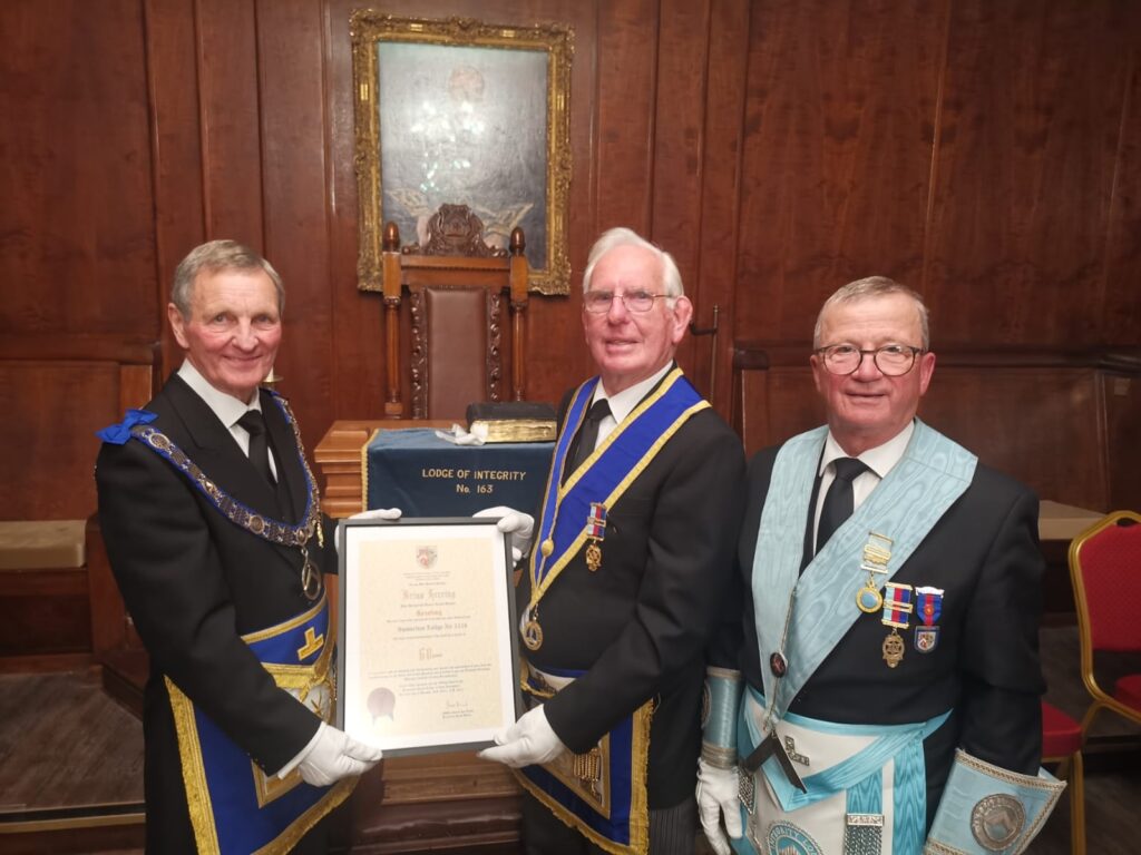 The members of the Lodge of Integrity no.163 attended in their numbers to support WBro Herring on his special occasion. The lodge was opened in due form, and the evening was further enhanced by the presence of the Deputy Provincial Grand Master of the Masonic Province of East Lancashire, VWBro John Farrington, who paraded into the lodge with a deputation of officers from the United Grand Lodge of England, the Provincial Secretary, and the Derby District Chairman.