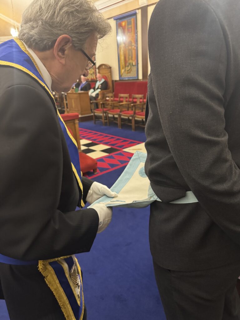 At a poignant moment, William’s grandfather presented him with his own original apron—the very one he had worn during his own Masonic journey. Carefully preserved over the years, it was passed down not just as an object, but as a symbol of legacy, continuity, and shared values. It was a gesture that resonated with everyone in the room.